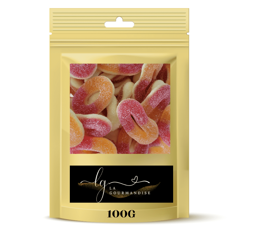 Sirop de glucose, sucre, gélatine , Acidifiants : acide citrique et acide lactique, Agent stabilisant d'humidité : sorbitol, Correcteur d'acidité : citrate de calcium, arômes, Colorants : E 102, E129.