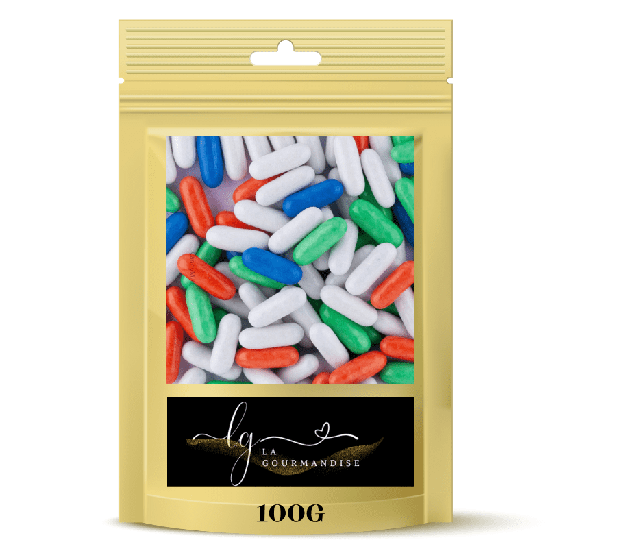 - sucre ; sirop de sucre de mélasse ; farine de blé ; amidon ; extrait de réglisse ; maltodextrine ; arôme ; colorants : curcumine, carmin, bleu patenté V, carotènes végétaux ; sel ; émulsifiant : mono- et diglycérides d'acides gras ; régulateur d'acidité : bicarbonate de sodium ; agents d'enrobage : cire d'abeille blanche et jaune, cire de carnauba