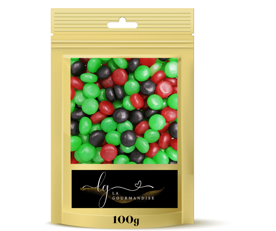 Sucre, sirop de glucose, amidon, Gélifiant : E440, gélatine, Acidifiant: E330, Correcteur d'acidité : E331, fécule, arômes, Colorants : E104, E110, E122, E124, E129, E131, E132, E133, E151, E153, huile végétale, Agent d'enrobage : cire de carnauba