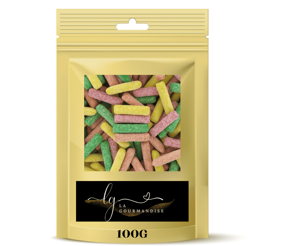 Sucre, sirop de glucose, dextrose, graisse de palme, 5% de jus de fruits à base de concentrés (pomme, pêche, citron, fraise, framboise), gélatine bovine, acidifiants : acide malique, acide lactique, acide citrique; stabilisant : gomme arabique; amidon modifié, arômes, émulsifiant : lécithines; colorants : curcumine, carmins, bleu brillant FCF.