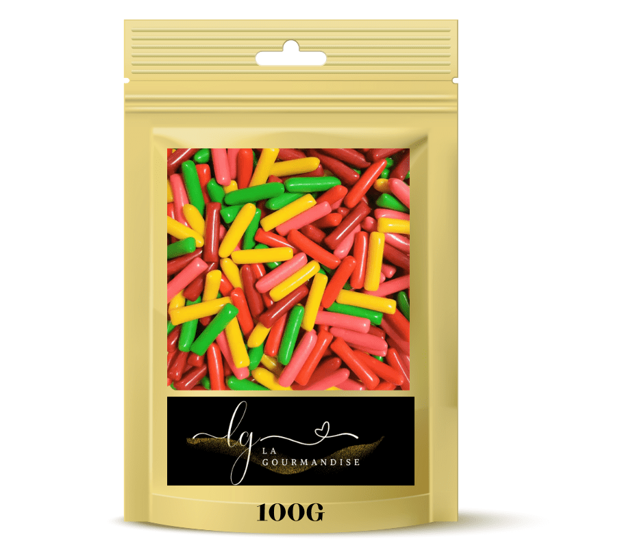 Sucre, sirop de glucose, dextrose, graisse de palme, 5% jus de fruits concentré (pomme, pêche, citron, fraise, framboise), gélatine (gélatine bovine), stabilisant: gomme arabique, amidon modifié, acidifiants: acide lactique, acide citrique, arômes, émulsifiant: lécithines, colorants: cochenille, curcumine, bleu brillant FCF, charbon végétal médicinal, agents d 'enrobage: cire de carnauba, shellac, cire d 'abeille blanche et jaune.