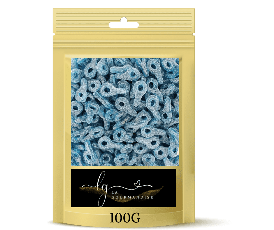 Ingrédients : Sirop de glucose, sucre, eau, gélatine de boeuf, amidon modifié de pomme de terre, acidifiants : E330, E270, E296, arômes, agent d'enrobage : cire de carnauba, colorant E133. Sans Gluten.